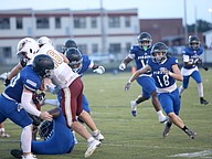Matanzas receiver Ladarien Baker is tackled after making a catch. Photo by Brent Woronoff