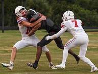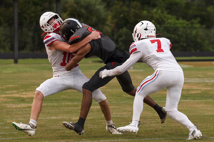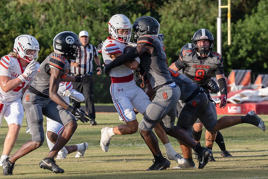 Seabreeze wingback Danny Spada's (center) punt return is stopped by Spruce Creek's Kaden Wooden (7) at the season opening game on Friday, Aug. 22. Photo by Michele Meyers