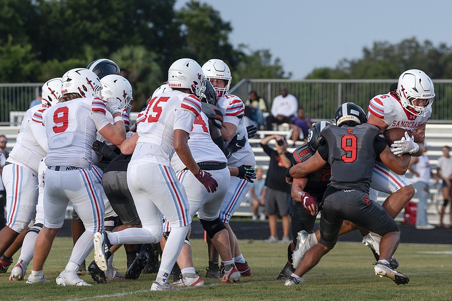 Seabreeze linebacker Tristian Miller (left) tackles Spruce Creek quarterback P.J. Miller (center) during the season opening game on Friday, Aug. 22. Photo by Michele Meyers