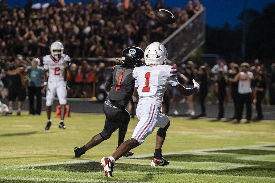 Spruce Creek's Cameron Oxendine (left) and Seabreeze's Zach Voltaire (right) battle for the catch in the season opener on Friday, Aug. 22. Photo by Michele Meyers