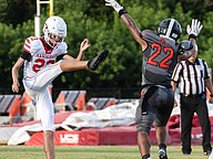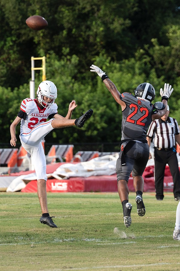 Spruce Creek's Baron Kocchi (22) attempts to block the kick by Seabreeze kicker Luke Zboch (left) during the season opener on Friday, Aug. 22. Photo by Michele Meyers