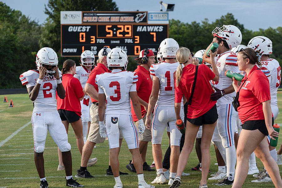 Water break for Seabreeze during the season opening game against Spruce Creek on Friday, Aug. 22. Photo by Michele Meyers