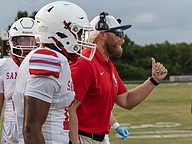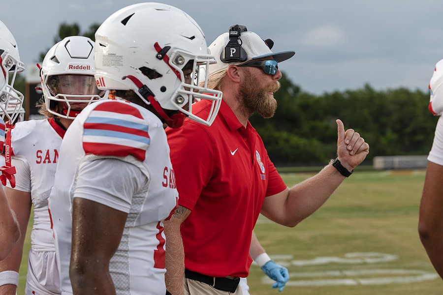 Seabrezze head coach Mike Klein motivates his players before sending them back out on the field during the season opener against Spruce Creek on Friday, Aug. 22. Photo by Michele Meyers
