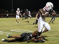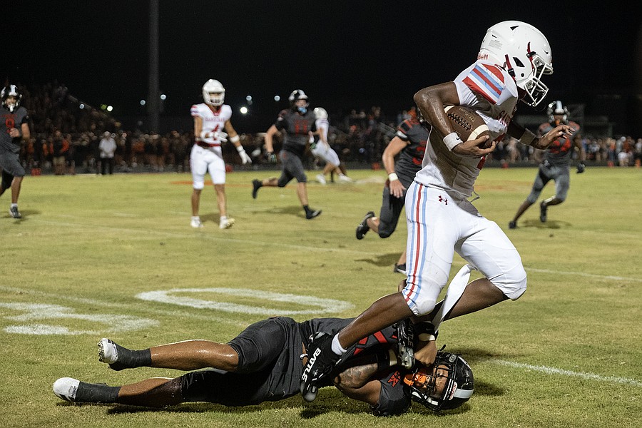 Seabreeze wide receiver Stephen Williams Jr. (right) gains some yardage before Spruce Creek freshman Baron Kocchi (left) makes the tackle during the season opening game on Friday, Aug. 22. Photo by Michele Meyers