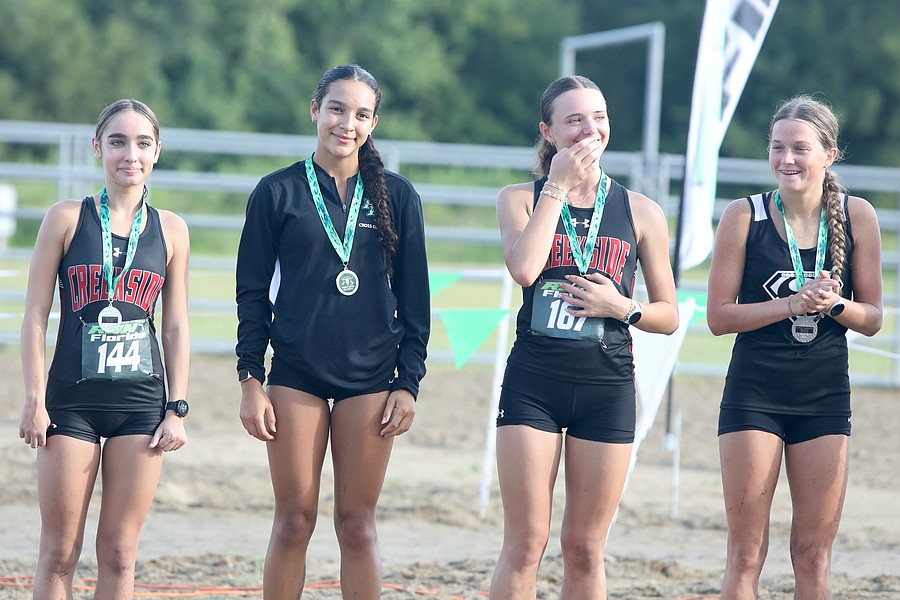 FPC's Arianna Slaughter (second from left) placed second overall and stands between winner Eva Delaney (left) and third-place finisher Emily Kate Longmire, both from Creekside. Photo by Brent Woronoff