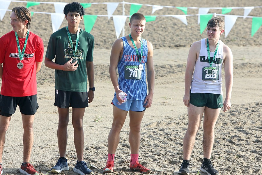 Seabreeze's Hunter Shuler holds up his medal after leading the Sandcrabs with a 33rd-place finish. Photo by Brent Woronoff