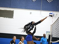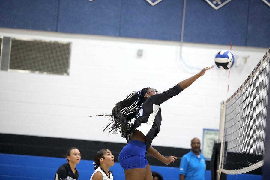 Mainland freshman Seyahna Sampson hits over the net. Photo by Brent Woronoff