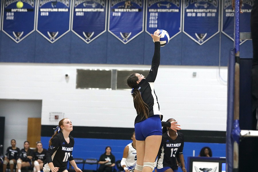 Matanzas junior Kaylie Christoff hits over the net. Photo by Brent Woronoff