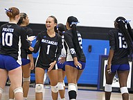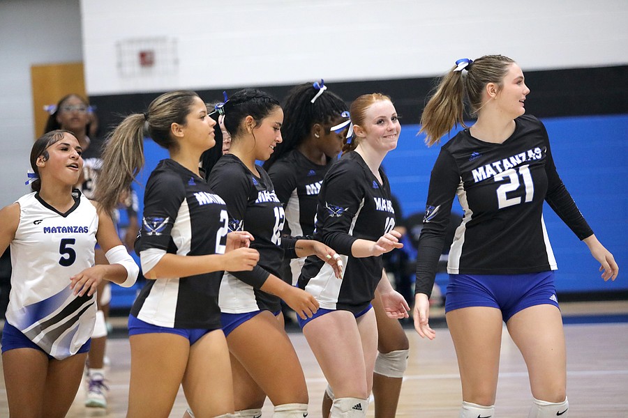 The Matanzas volleyball team celebrates a three-set victory over Mainland in its season-opening match. Photo by Brent Woronoff