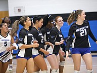 Matanzas senior Olivia Chochev (1) celebrates a point with her teammates. Photo by Brent Woronoff
