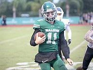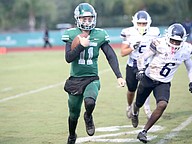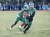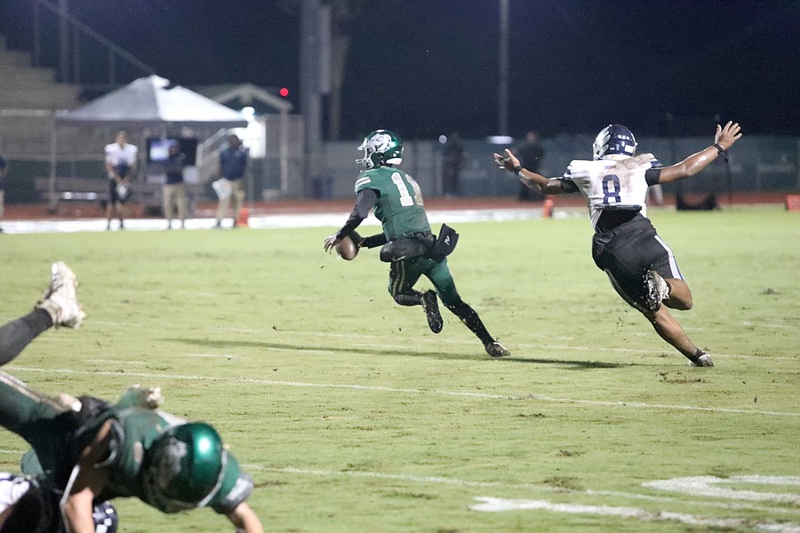 Flagler Palm Coast quarterback Caden Burchfield is chased out of bounds. Photo by Brent Woronoff