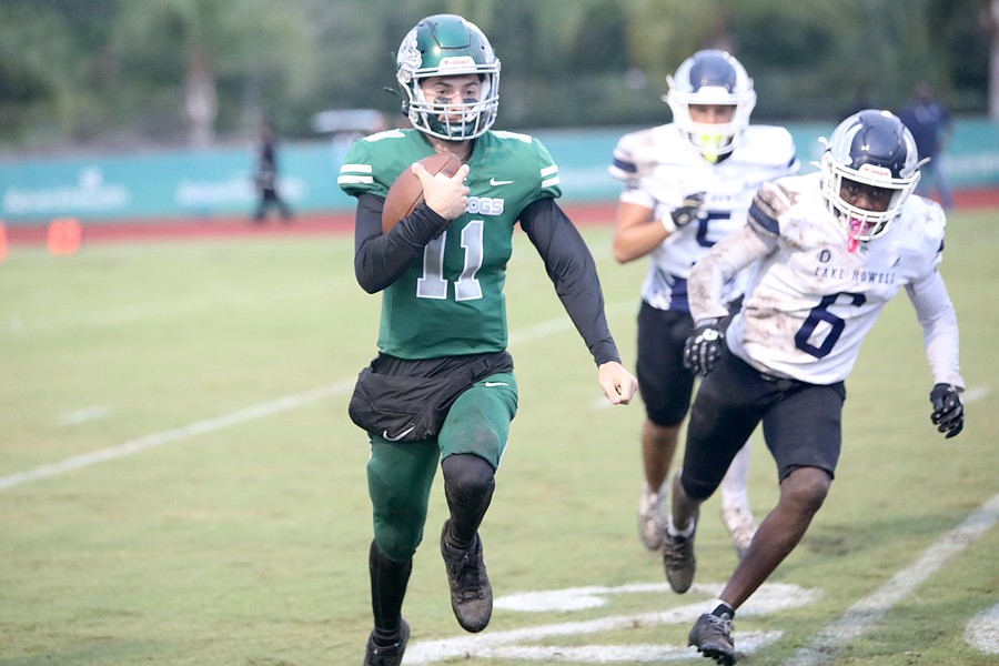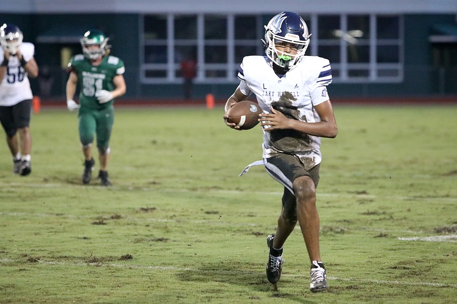 Lake Howell quarterback Brycen Marbrey, whose uniform might require extra detergent after the game, runs out of bounds. Photo by Brent Woronoff