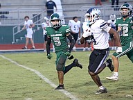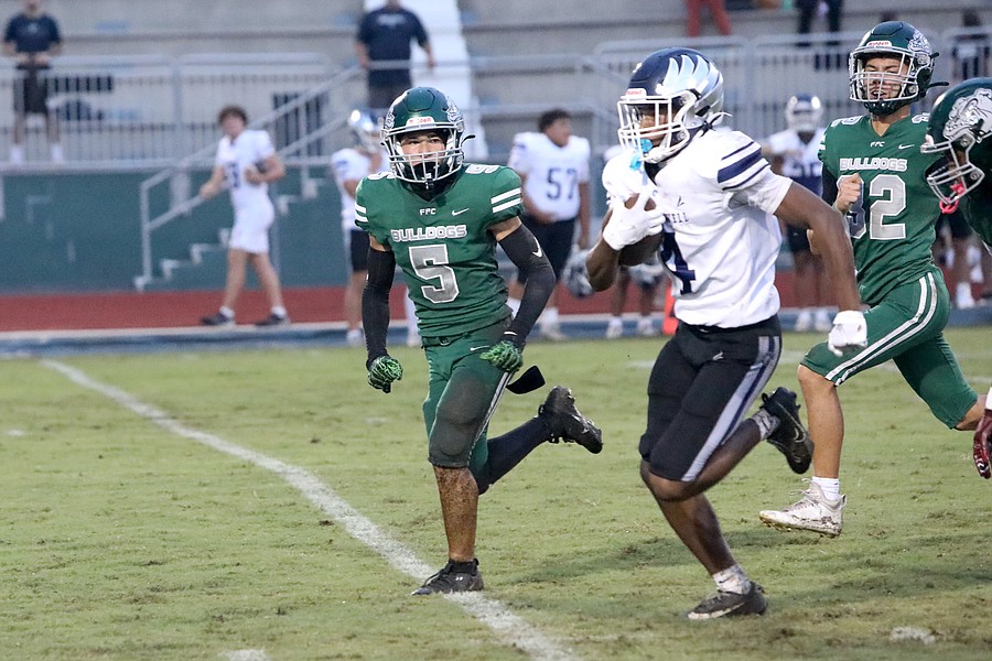 FPC defensive backs Lucas Siharaj (5) and Kayson Magsino chase Lake Howell's Jayvon Funnye on a kickoff return. Photo by Brent Woronoff