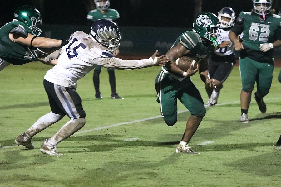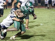 FPC running back Darwin Harris (25) tries to break out of the grasp of a Lake Howell defender. Photo by Brent Woronoff