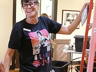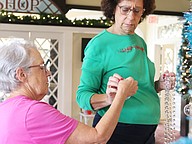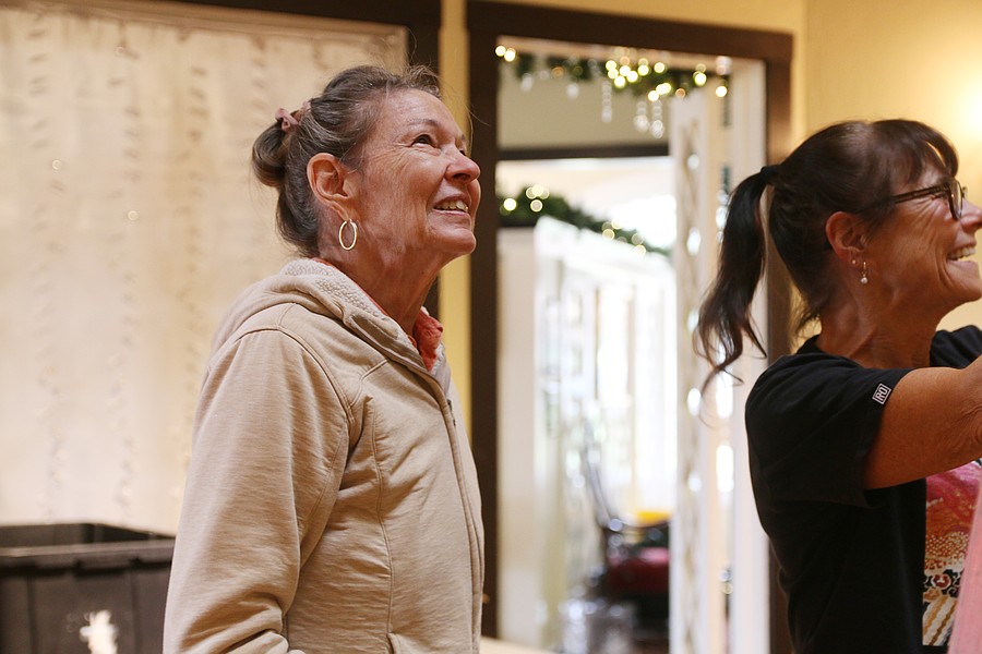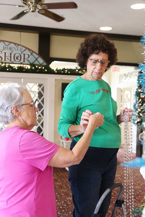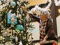 Margie Sheppard laughs as she works to decorate The Casements' Christmas tree. Photo by Jarleene Almenas