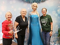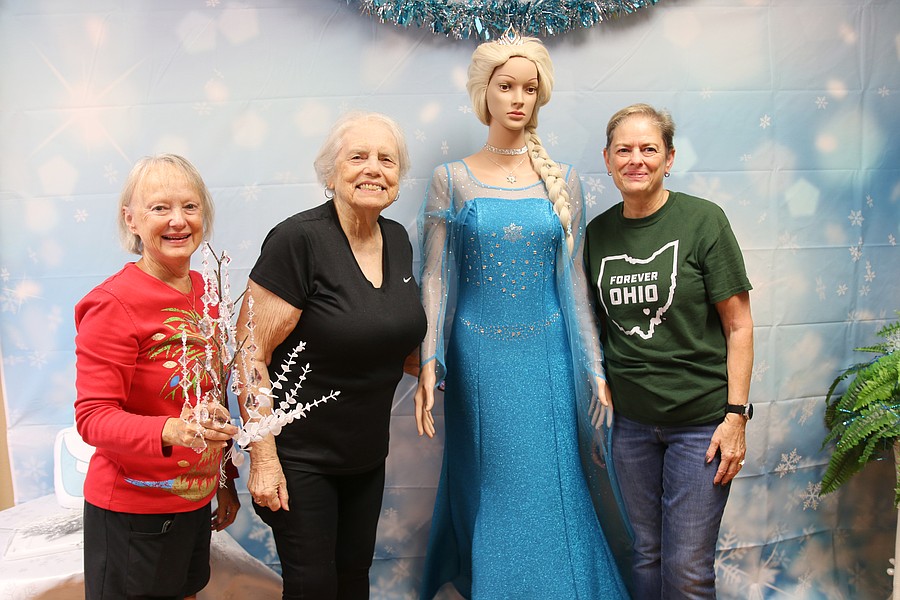 Mare Koehnecke, Linda Bonis and Paula McMurray-Schwarz pose with the Elsa mannequin inside The Casements. Photo by Jarleene Almenas