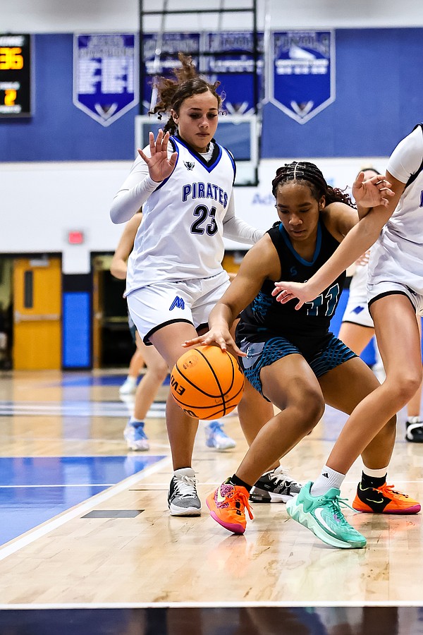 Atlantic's Zhaveya Watson dribbles between Paiden Hickman (23) and Aurora Purdy (12). Photo by Keishia McLendon