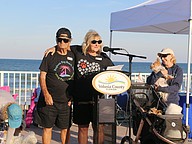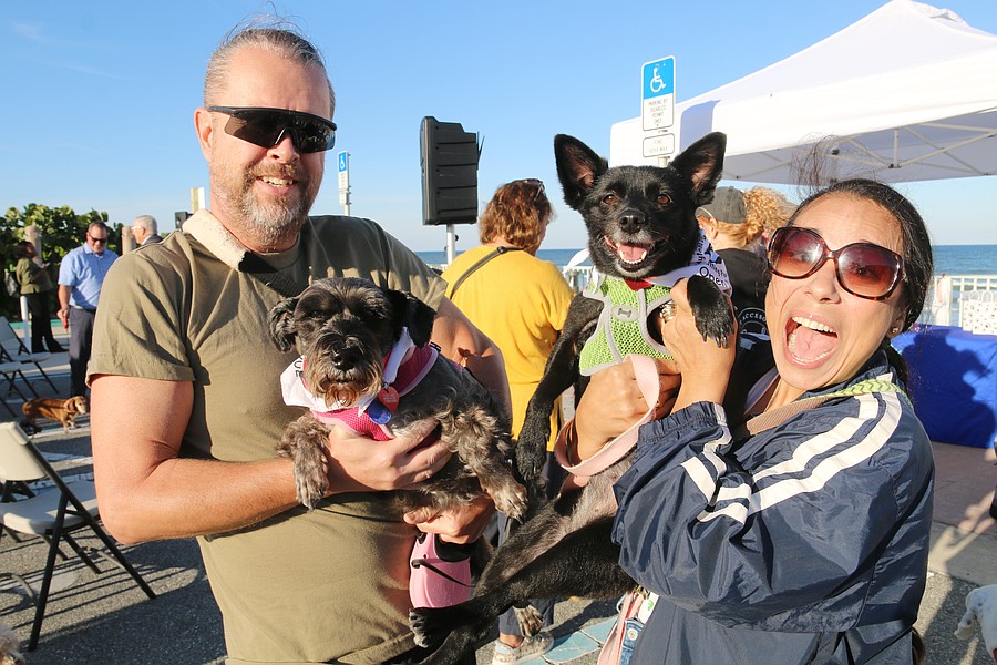 Brenda and Paul Niederkorn, their dog Roscoe, and three other ribbon-cutting attendees, with their dog Saoirse, enjoy the beach. Photo by Jarleene Almenas