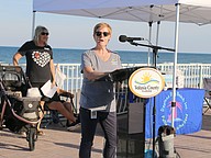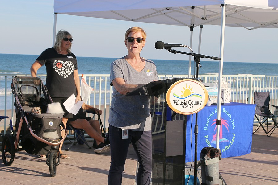 Volusia County Public Protection Director Randa Matusiak speaks during the ribbon-cutting ceremony for the new dog beach in Daytona. Photo by Jarleene Almenas