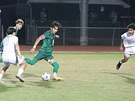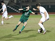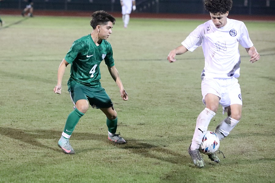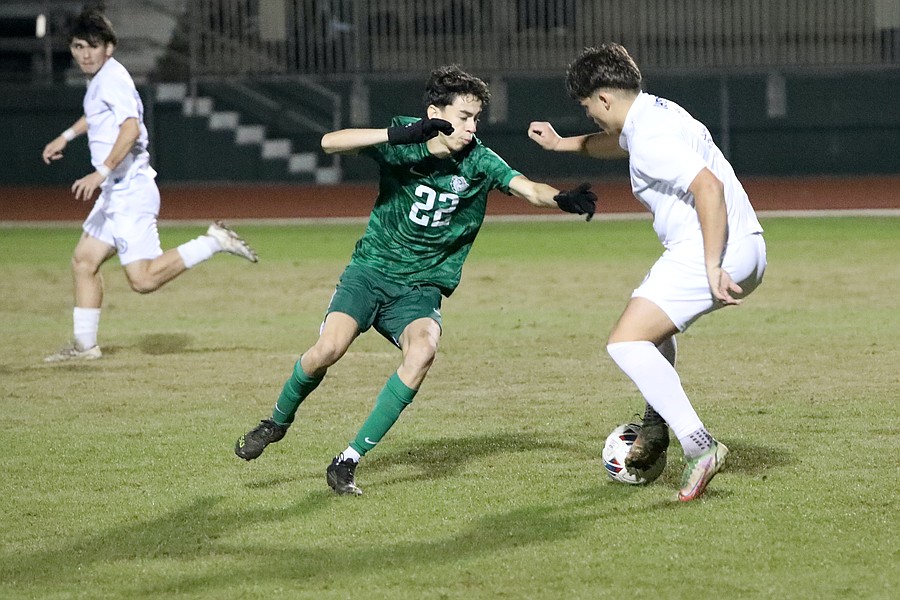 FPC center back Jonathan Perez (22) marks a Sandalwood player. Photo by Brent Woronoff
