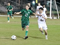 FPC's Dylan Hardesty (17) battles for possession. Photo by Brent Woronoff