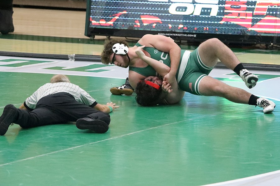 Aidan Korth pinned his opponent in 31 seconds in the 285-pound match. Photo by Brent Woronoff