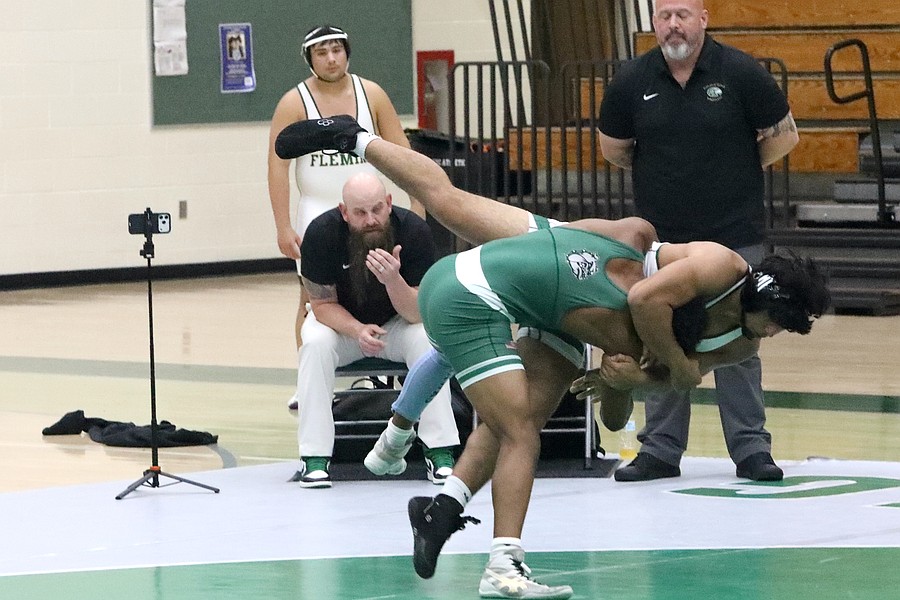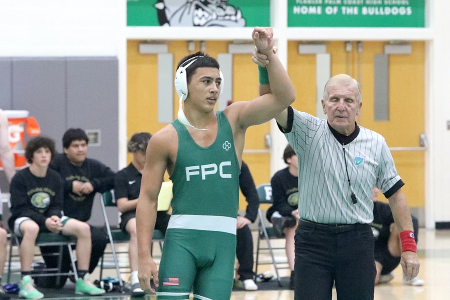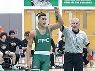 FPC defeated Fleming Island 64-12 at the Bulldogs' main gym on Wednesday, Dec. 3. FPC won 12 of 14 matches. Freshmen Buster Bossardet (8-5 decision at 126 pounds), Jacob Hald (17-2 technical fall at 2:00 at 106 pounds) and Jojo Foalima (pin in 33 seconds at 175 pounds) all began their high school wrestling careers with a victory.