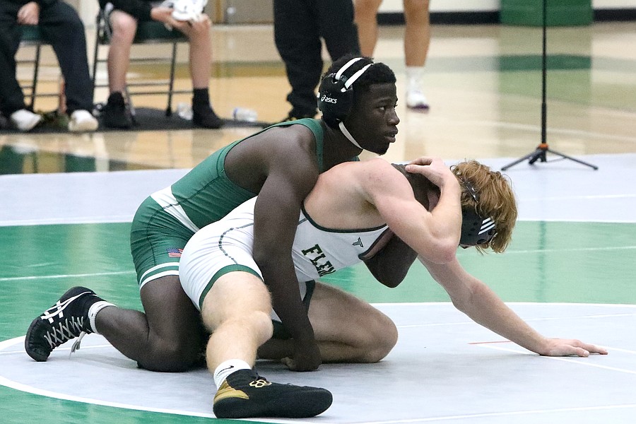 FPC's Gabriel Moy wrestled Fleming Island's Brant Rountree, winning by fall in the second period. Photo by Brent Woronoff