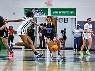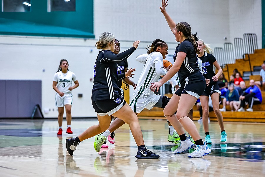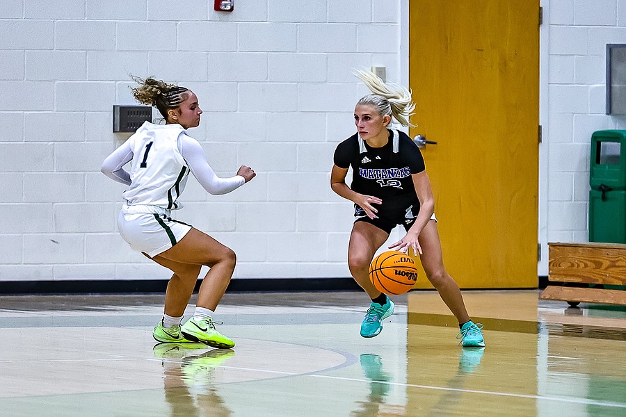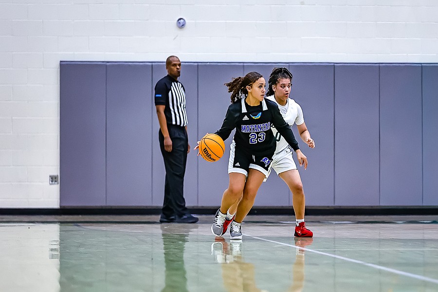 Matanzas' Paiden Hickman (23) dribbles around Le'Nai Ramsey's pressure defense. Photo by Keishia McLendon