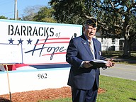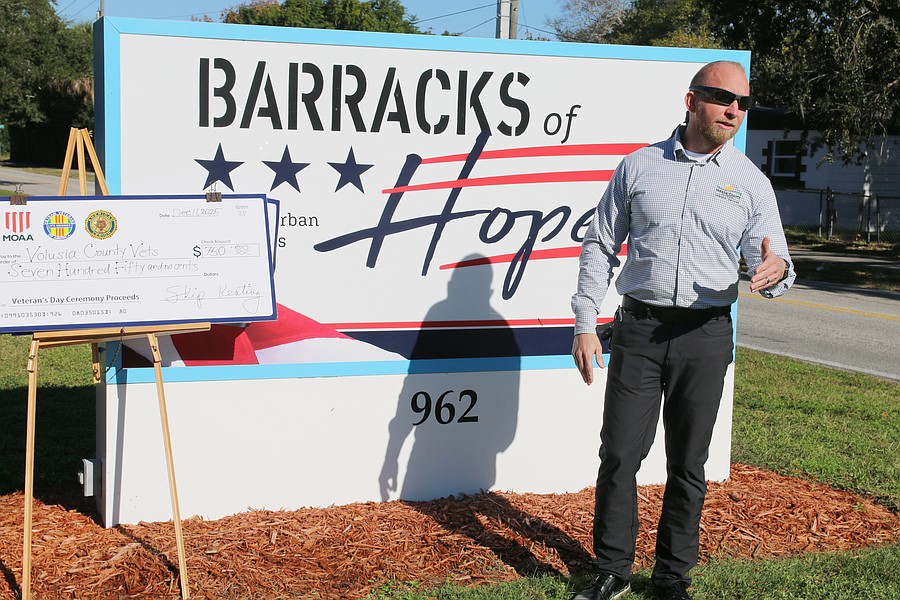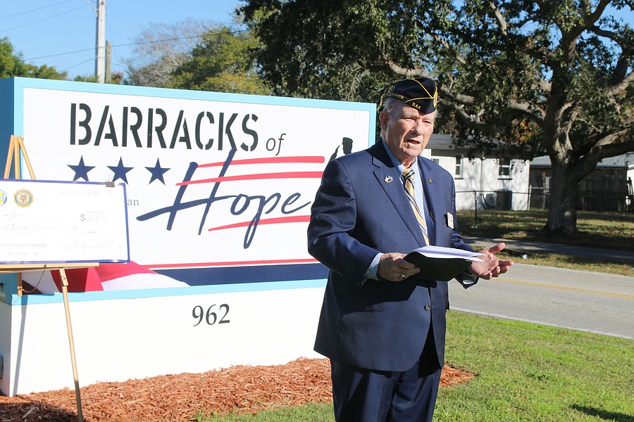 Volusia County Veterans Services Director Scott Olson speaks during the check presentation at Barracks of Hope on Thursday, Dec. 11. Photo by Jarleene Almenas