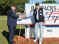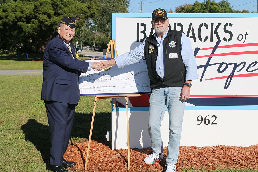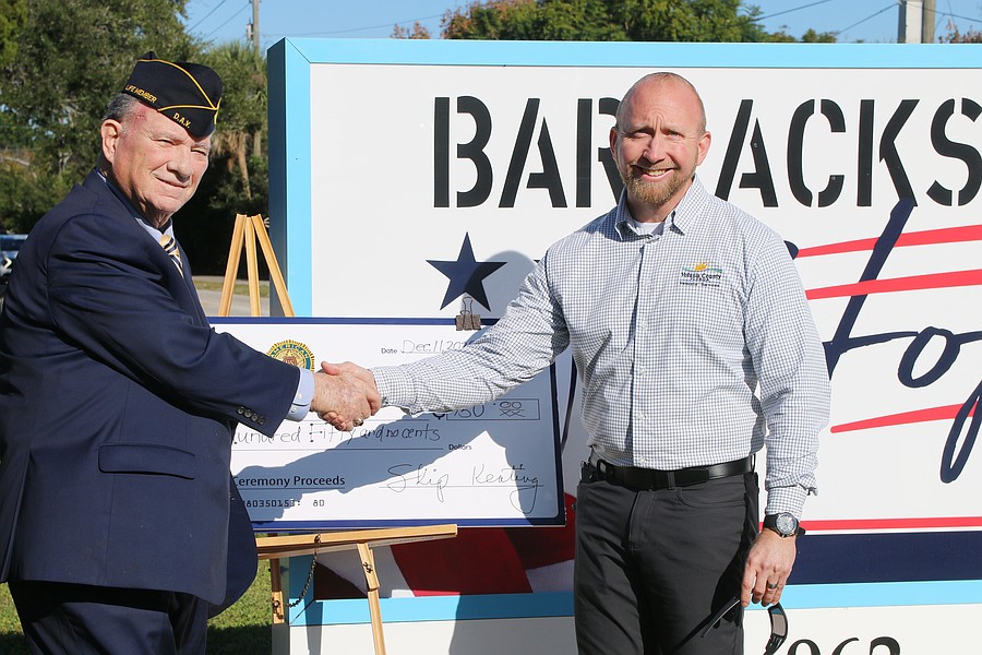 Skip Keating, a director with the Military Officers Association of America Halifax Area Chapter, presents a check to Volusia County Veterans Services Director Scott Olson at Barracks of Hope on Thursday, Dec. 11. Photo by Jarleene Almenas