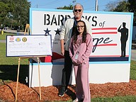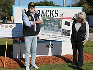 Bob Adkins, past president of the Vietnam Veterans of America Chapter 1048, and his wife Cathy Adkins, hold up a poster of the future Vietnam Veterans Memorial during the check presentation at Barracks of Hope on Thursday, Dec. 11. Photo by Jarleene Almenas