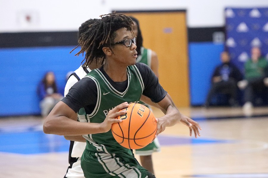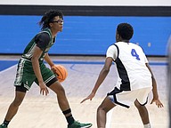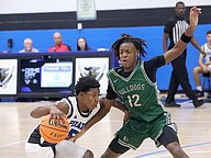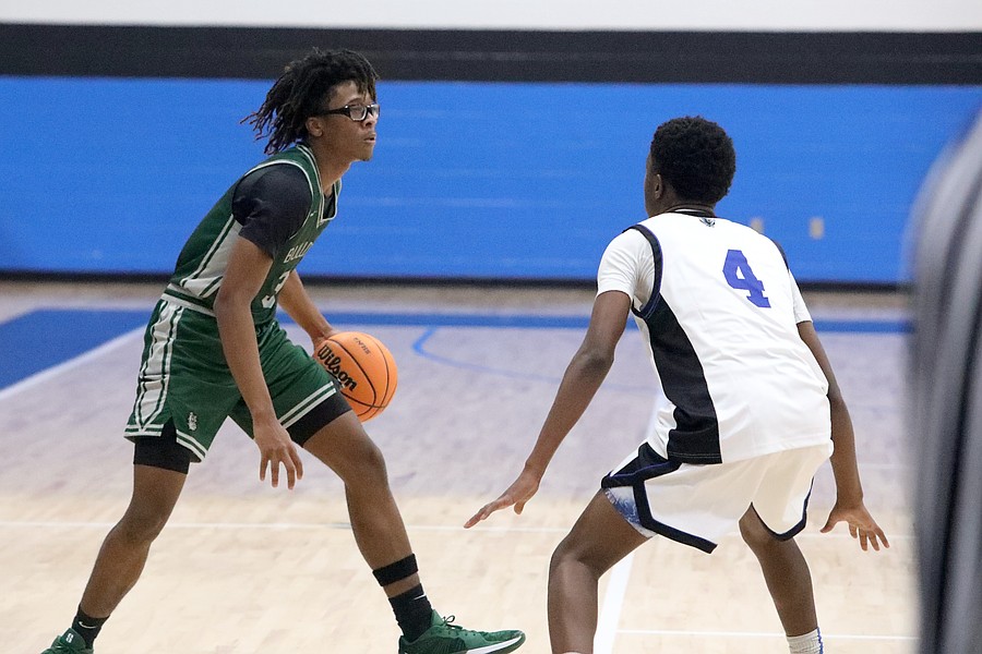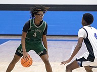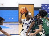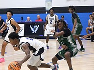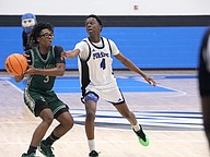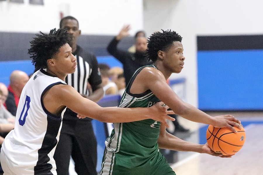 FPC's Anthony Hampton (3) looks for an opening against Curtis Giles (4). Photo by Brent Woronoff