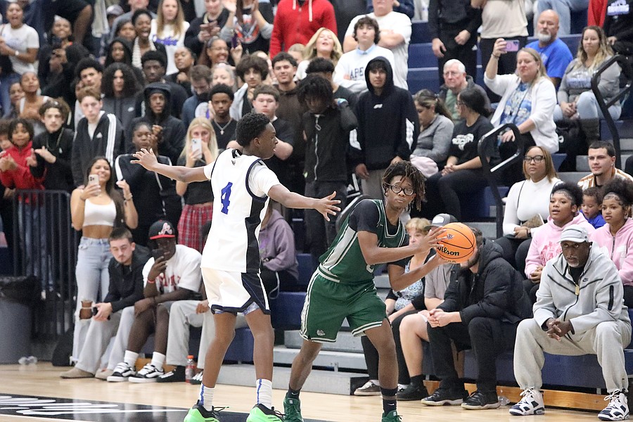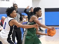 Matanzas' Curtis Giles (4) defends against Anthony Hampton. Photo by Brent Woronoff