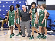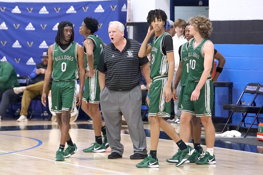 FPC coach Greg Shirley and the Bulldogs come out of a timeout. Photo by Brent Woronoff