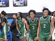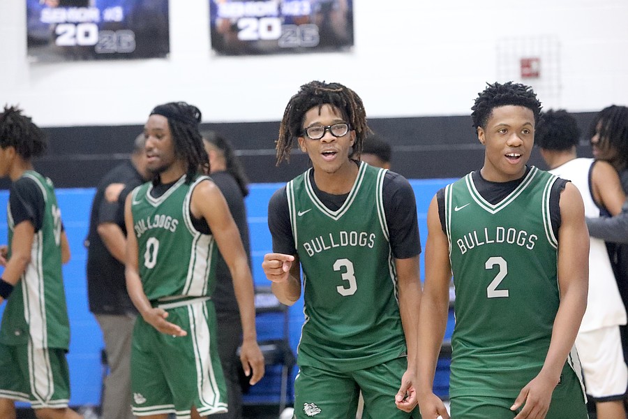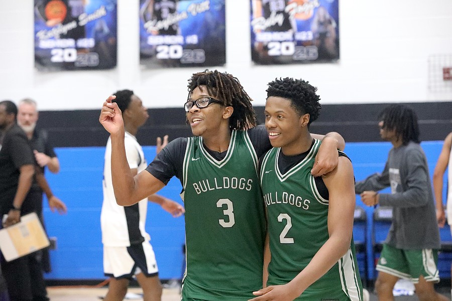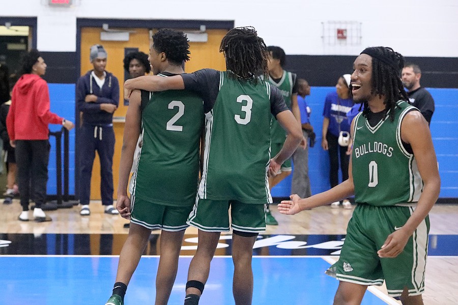Nateshawn Royal, Anthony Hampton and Nate Perry celebrate the Bulldogs' victory over Matanzas. Photo by Brent Woronoff