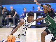Nate Perry looks for an opening as Jez McCoy (2) defends. Photo by Brent Woronoff