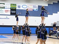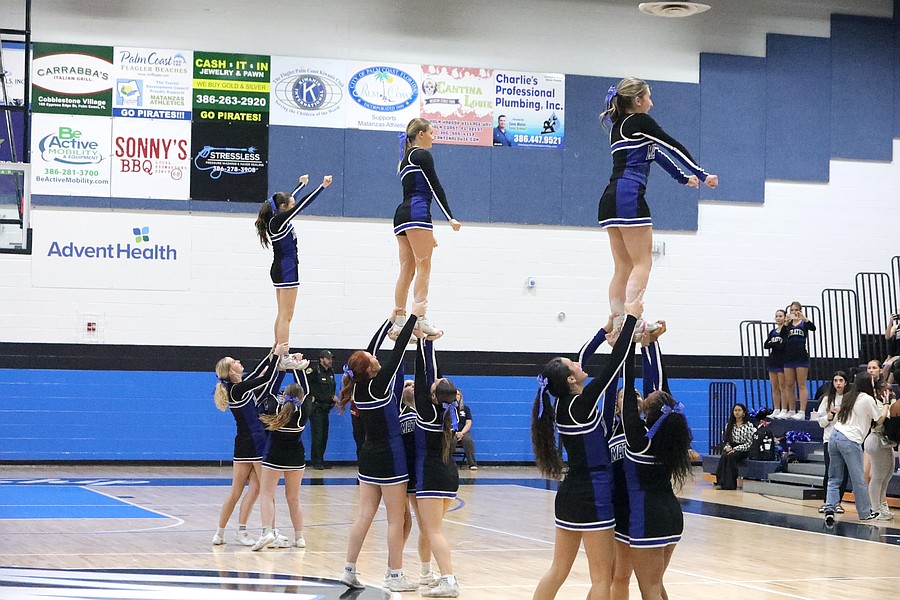 Matanzas cheerleaders perform a stunt at halftime. Photo by Brent Woronoff