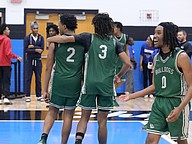 Nate Perry (2), Anthony Hampton (3) and Nateshawn Royal celebrate FPC's victory over Matanzas. Photo by Brent Woronoff