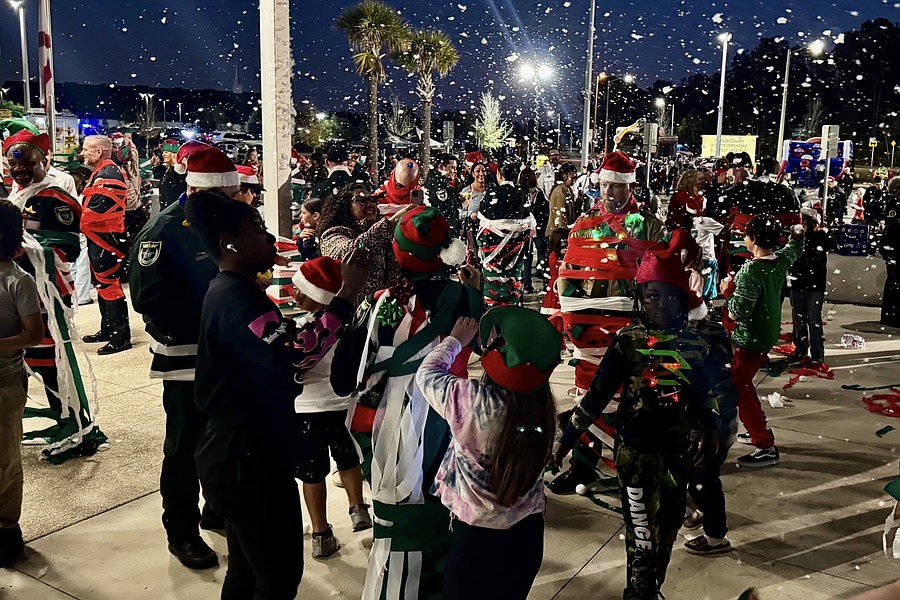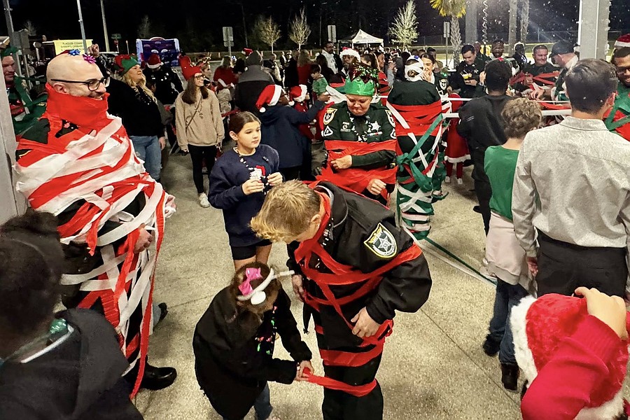 The FCSO hosted a holiday party at the Operations Center ahead of taking Flagler children to Walmart. Pictured: kids wrap officers in Christmas decorations. Courtesy of the FCSO