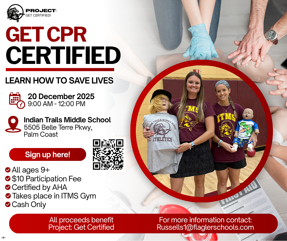Project: Get Certified is offering a CPR certification course for anyone ages 9 and above on Saturday, Dec. 20, from 9 a.m. to noon at the Indian Trails Middle School gym. Cost is $10 (cash only).