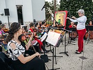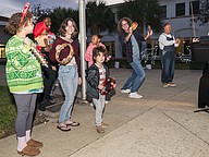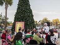 Drew Flickama (second from right) encourages the audience to join the Ormond String Orchestra before the lighting of the Christmas tree and the 34th annual HOme for the HOlidays parade on Saturday, Dec. 13. Photo by Michele Meyers