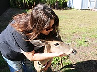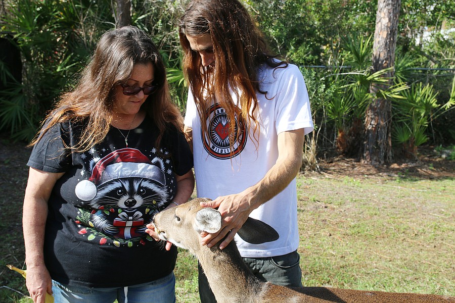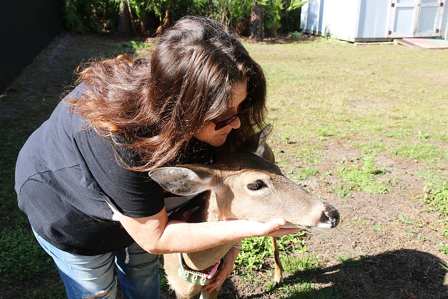 Samadhi Wildlife Founder and President Dawn Barbone pets Faithie, a non-releasable deer she raised since she was a fawn. Photo by Jarleene Almenas