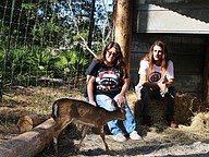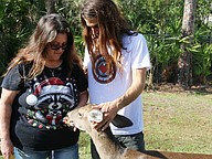 Samadhi Wildlife Founder and President Dawn Barbone and her partner, Vice President Jesse Heilman enjoy a moment inside an enclosure with a fawn. Photo by Jarleene Almenas