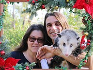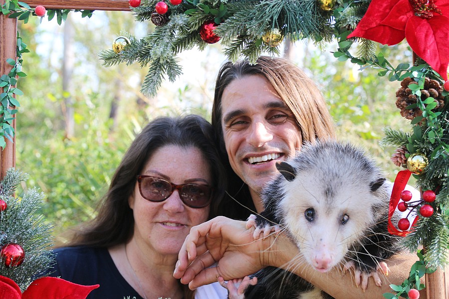 Samadhi Wildlife Founder and President Dawn Barbone and her partner, Vice President Jesse Heilman, pose with Bean, an opossum and Samadhi Wildlife animal ambassador. Bean came to Samadhi Wildlife after he was attacked by a dog. Photo by Jarleene Almenas