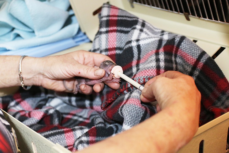 Dawn Barbone feeds a baby squirrel with a syringe inside her home. Photo by Jarleene Almenas