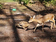 Tommy, an African Sulcata tortoise, strolls alongside a fawn inside an enclosure at Samadhi Wildlife. Photo by Jarleene Almenas