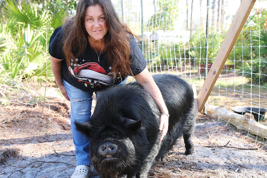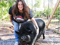 Samadhi Wildlife Founder and President Dawn Barbone smiles with Otis, a domesticated pig. Photo by Jarleene Almenas