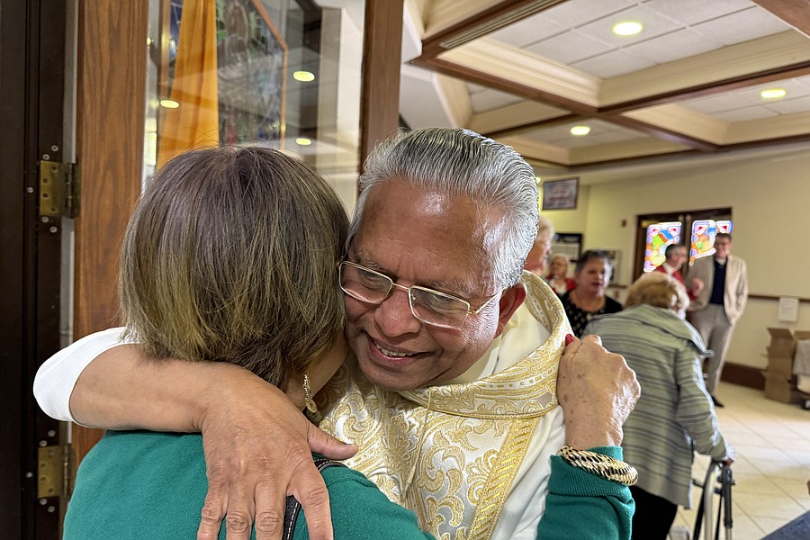 Father Jose Panthaplamthottiyil embraced dozens of parishioners after his Golden Jubilee Mass on Dec. 17, 2025. Photo by Brian McMillan