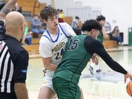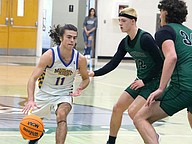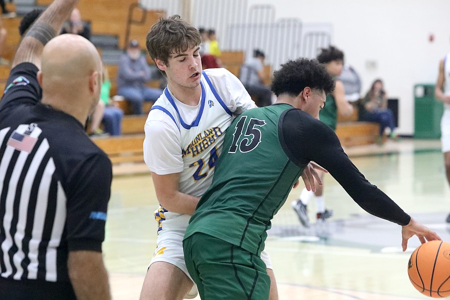 Reece Casto (24) guards Sickles' Adrian Thomas. Photo by Brent Woronoff